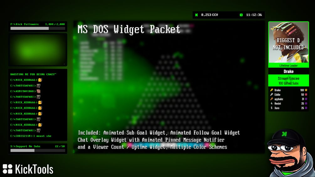 Introducing the MS Dos Widget Pack by KickTools—a complete overlay theme package for Kick streamers that brings the nostalgic charm of the old DOS operating system to your streams. This widget pack is designed to enhance your live stream with a cohesive retro look, featuring the iconic IBM VGA font, high-contrast colors, and smooth animations. Here’s what you get: